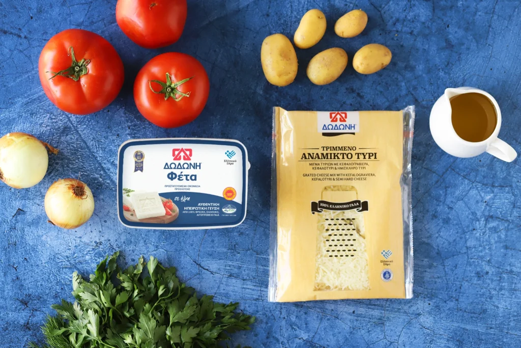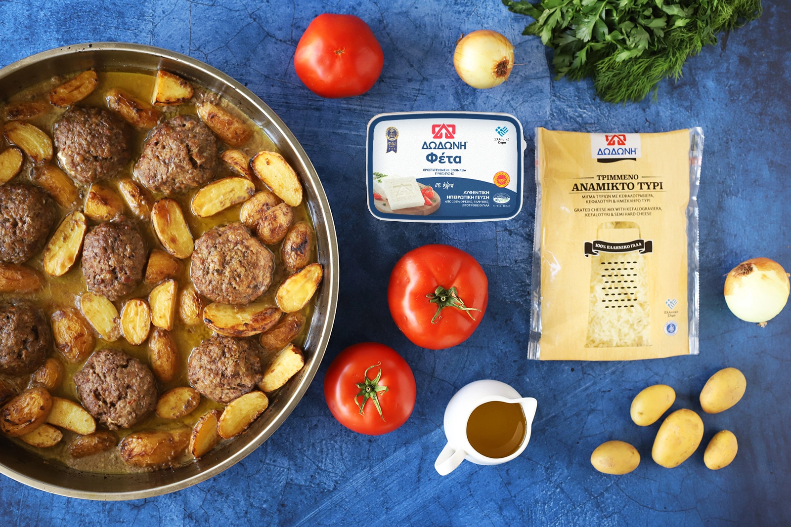 Βάζουμε τον κιμά σε ένα μπολ, τρίβουμε τα κρεμμύδια και τις ντομάτες, κατευθείαν μέσα στον κιμά να πάρουμε όλα τα υγρά τους. Βρέχουμε καλά το ψωμί, το στραγγίζουμε και το ψιχουλιάζουμε στον κιμά. Προσθέτουμε όλα τα υπόλοιπα υλικά εκτός από την φέτα. Ζυμώνουμε πολύ καλά, για να αφρατέψει το μείγμα. Πλάθουμε σε 12 ή 14 κομμάτια και βάζουμε στο κέντρο από ένα μπαστουνάκι φέτας. Τα τοποθετούμε πάνω στις ήδη ψημένες πατάτες. Αφαιρούμε το αλουμινόχαρτο και συνεχίζουμε το ψήσιμο για 30 λεπτά ακόμα.