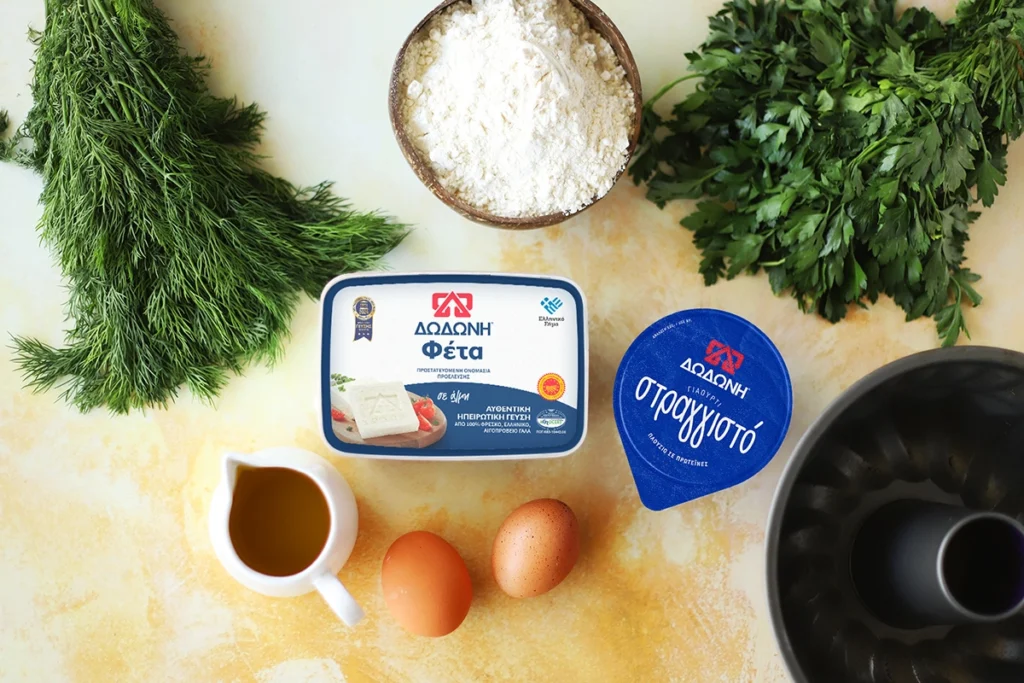• Σε ένα μπολ ανακατεύουμε το αλεύρι, το μπέικιν πάουντερ, το λάδι, τα αβγά και το γιαούρτι. Προσθέτουμε όλα τα υπόλοιπα υλικά, με τελευταία τη φέτα σε μεγάλα κομμάτια για να μην εξαφανιστεί στο ψήσιμο. Βάζουμε το μείγμα σε λαδωμένη και αλευρωμένη φόρμα του κέικ και ψήνουμε στους 175°C για 1 ώρα.