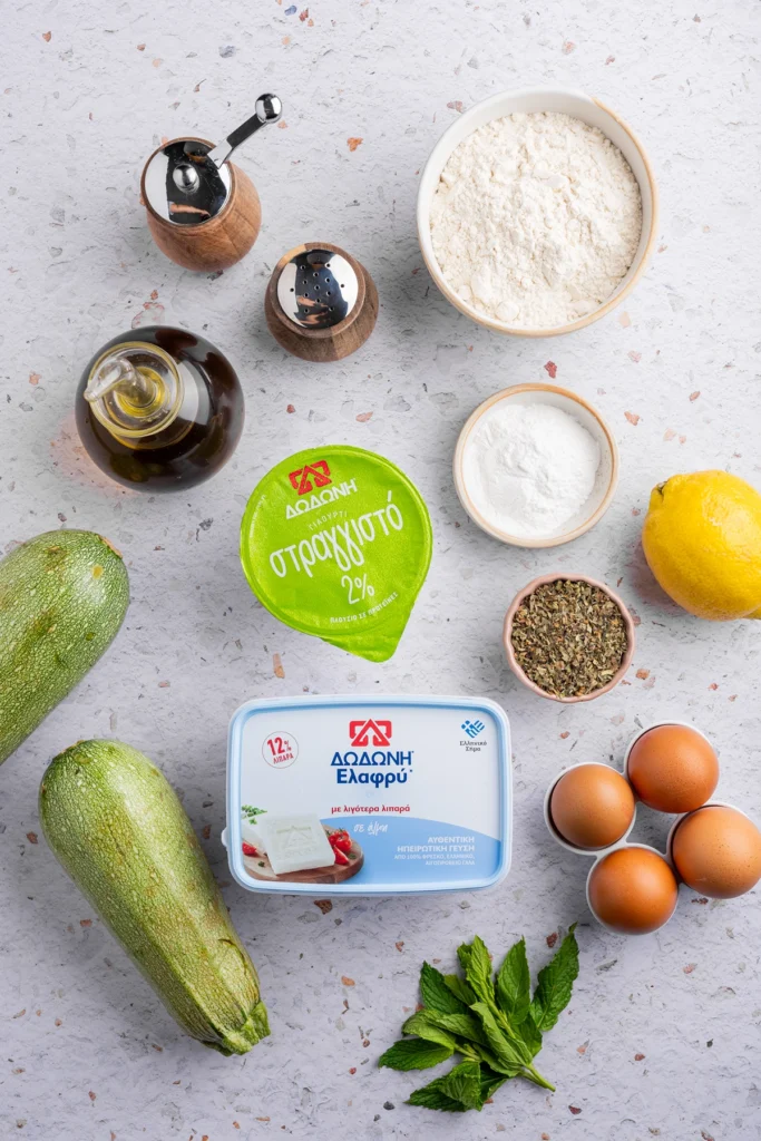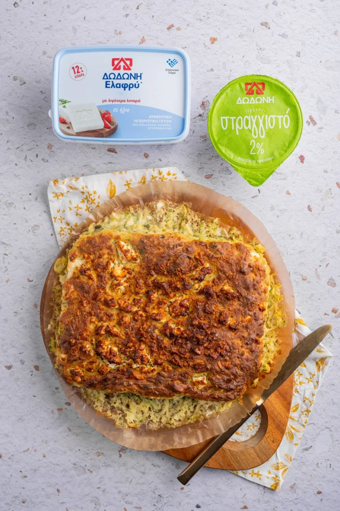 Προσθέτουμε τα αυγά, τη μισή φέτα ΔΩΔΩΝΗ σπασμένη με τα χέρια μας, το ξύσμα από το λεμόνι, αλάτι, πιπέρι, το ελαιόλαδο, το γιαούρτι ΔΩΔΩΝΗ Στραγγιστό και ανακατεύουμε.