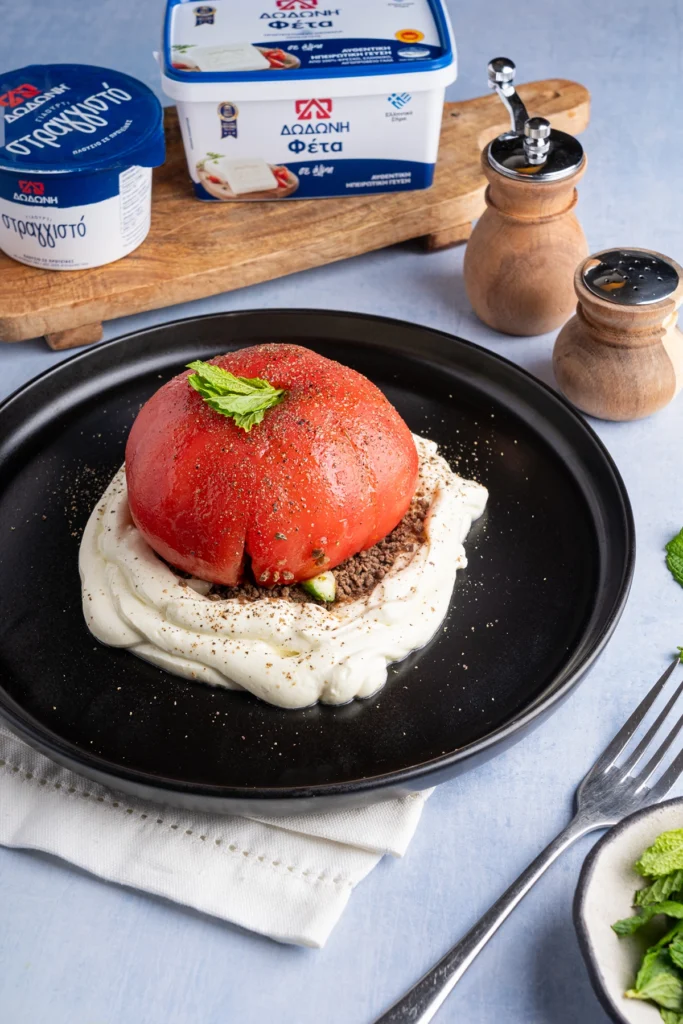 Τέλος, πάνω από τη μους και τα παξιμάδια, τοποθετούμε την τομάτα ανάποδα.