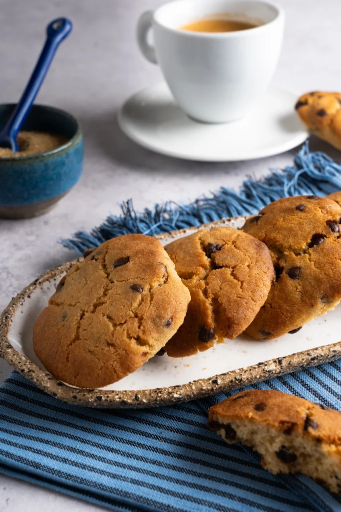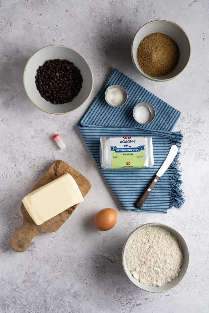 Προσθέτουμε το αλεύρι, το μπέικιν πάουντερ, το αλάτι και τις σταγόνες σοκολάτας και χτυπάμε μέχρι να δημιουργηθεί μια σφιχτή ζύμη.