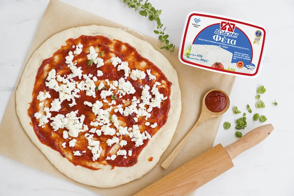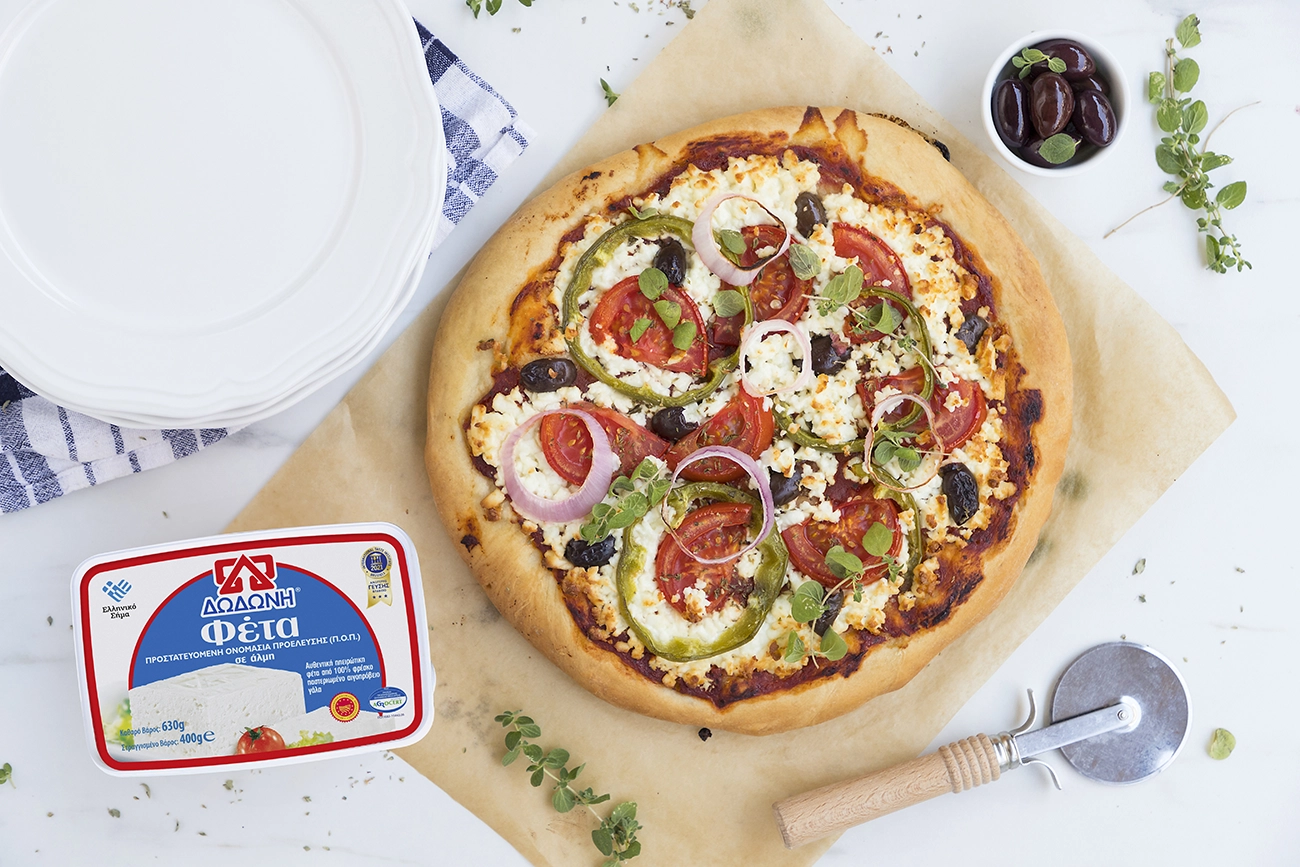 Ξεκινάμε από τη ζύμη. Σε μπολ, ανακατεύουμε τη μαγιά με το νερό και αφήνουμε το μείγμα για 5 λεπτά. Σε άλλο μπολ ανακατεύουμε το αλεύρι, τη ζάχαρη και το αλάτι. Προσθέτουμε το ελαιόλαδο και το μείγμα της μαγιάς και ανακατεύουμε με τα χέρια μας μέχρι να σχηματιστεί κολλώδης ζύμη. Μεταφέρουμε τη ζύμη σε ελαφρώς αλευρωμένη επιφάνεια και αρχίζουμε να την πλάθουμε. Προσθέτουμε λίγο λίγο αλεύρι (1 κ.σ. τη φορά) στη ζύμη, ώστε σταδιακά να γίνει λιγότερο κολλώδης. Αυτή η διαδικασία θα διαρκέσει 5-7 λεπτά. Μόλις το ζυμάρι γίνει μαλακό, εύπλαστο και δεν κολλάει στα χέρια, το μεταφέρουμε πίσω στο μπολ. Λαδώνουμε ελαφρά το ζυμάρι και το μετακινούμε μέσα στο μπολ, ώστε να καλυφθεί όλο από το ελαιόλαδο. Σκεπάζουμε το μπολ με καθαρή πετσέτα και το αφήνουμε σε ζεστό μέρος, μέχρι να διπλασιαστεί σε όγκο (για περίπου 1 ώρα). Ξαναζυμώνουμε τη ζύμη για λίγο και τη μεταφέρουμε σε αλευρωμένη επιφάνεια. Την ανοίγουμε με τα χέρια ή με πλάστη, σε δίσκο διαμέτρου 25 εκ. και την τοποθετούμε σε ταψί περασμένο με λαδόκολλα. Προθερμαίνουμε το φούρνο στους 220o C. Απλώνουμε τη σάλτσα ντομάτας στην πίτσα. Πασπαλίζουμε με τη φέτα ΔΩΔΩΝΗ και από πάνω βάζουμε τη ντομάτα, την πιπεριά, το κρεμμύδι και τις ελιές. Πασπαλίζουμε με ρίγανη. Ψήνουμε την πίτσα στους 220o C για περίπου 25 λεπτά, ή μέχρι να πάρει καλό χρώμα. Σερβίρουμε την πίτσα ζεστή, ραντισμένη με λίγο ελαιόλαδο.