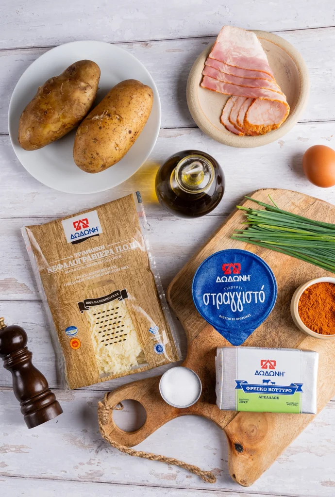 Γεμίζουμε τις πατάτες με το μείγμα και πασπαλίζουμε με κεφαλογραβιέρα ΔΩΔΩΝΗ.