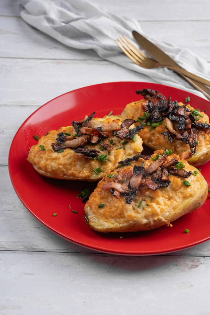 Κόβουμε προσεκτικά τις πατάτες στη μέση κατά μήκος. Αφαιρούμε το εσωτερικό της πατάτας, αφήνοντας το δέρμα απαλό.