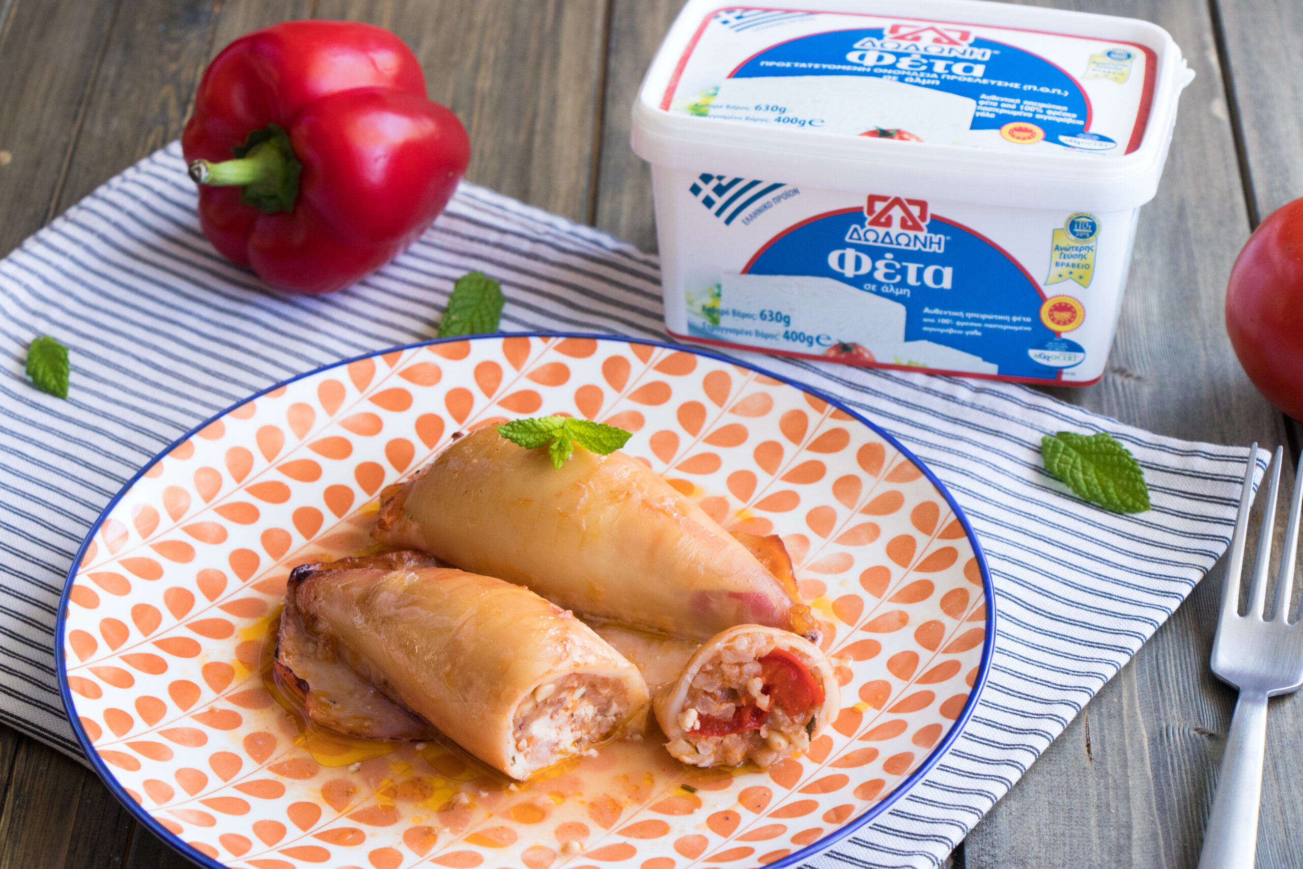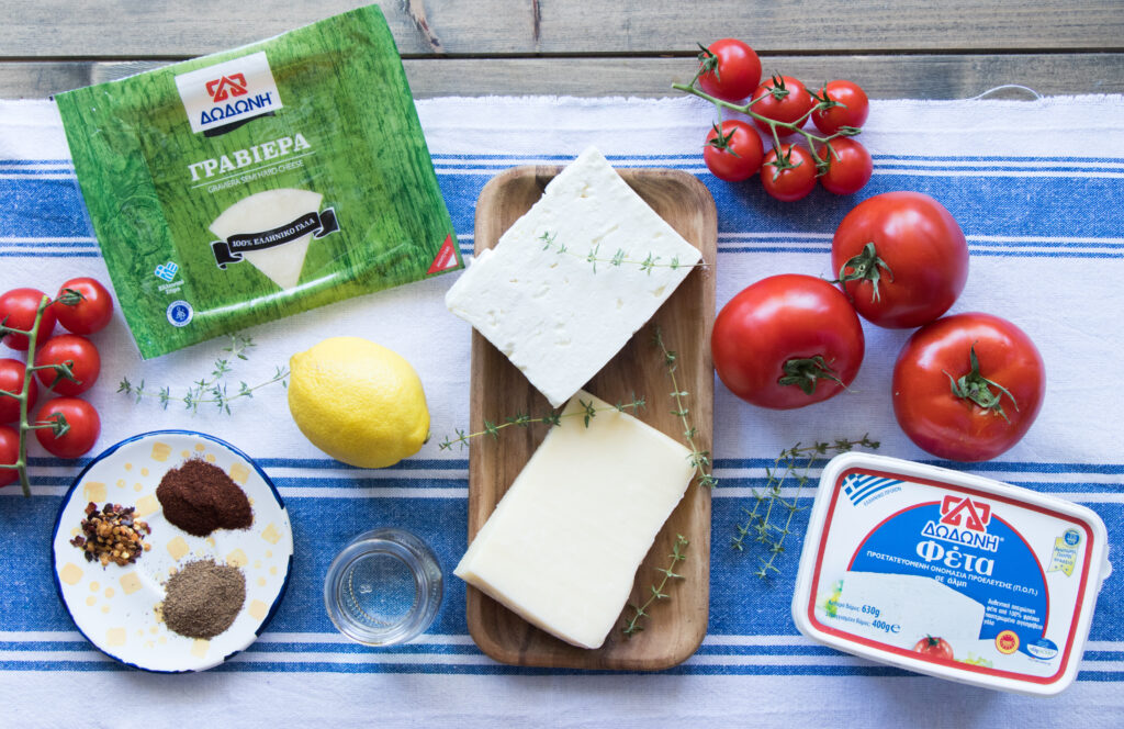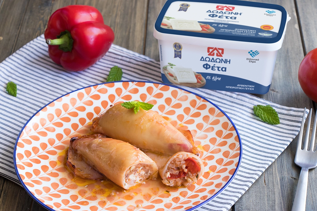 Θρυμματίζω στη γέμιση τη φέτα ΔΩΔΩΝΗ και την τριμμένη γραβιέρα ΔΩΔΩΝΗ και ανακατεύω.