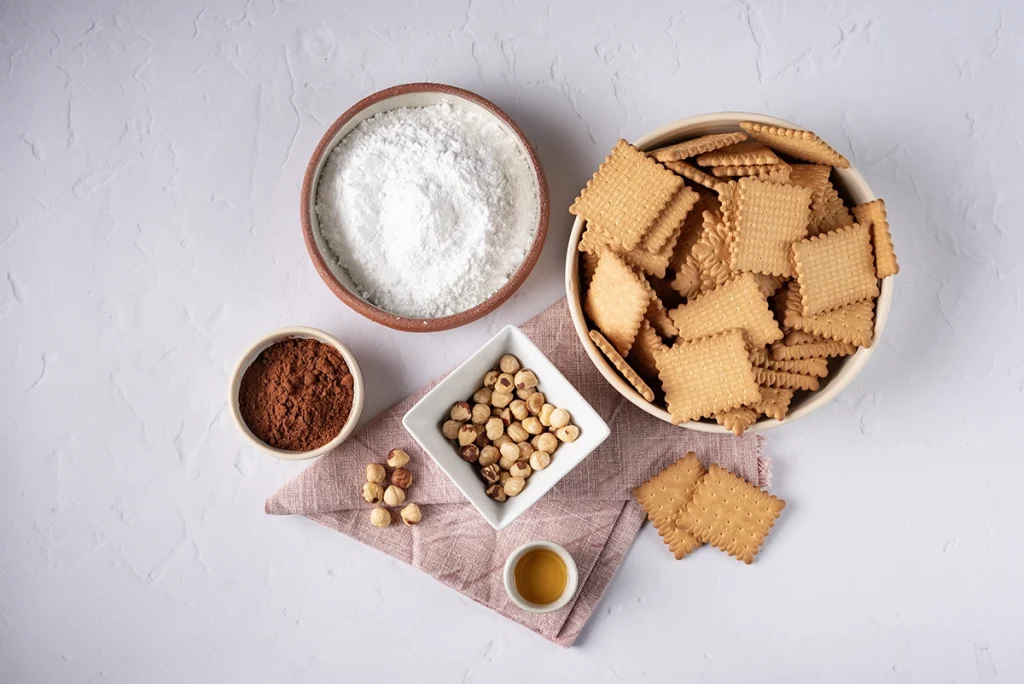 • Σπάμε και θρυμματίζουμε τα μπισκότα με το χέρι.