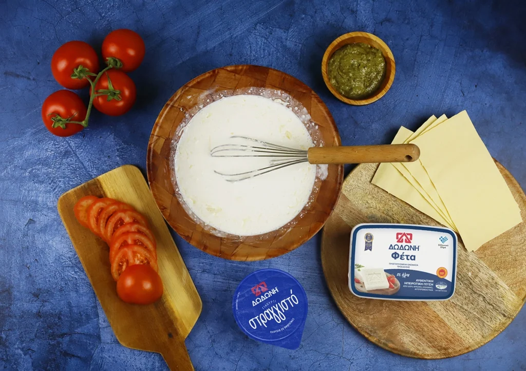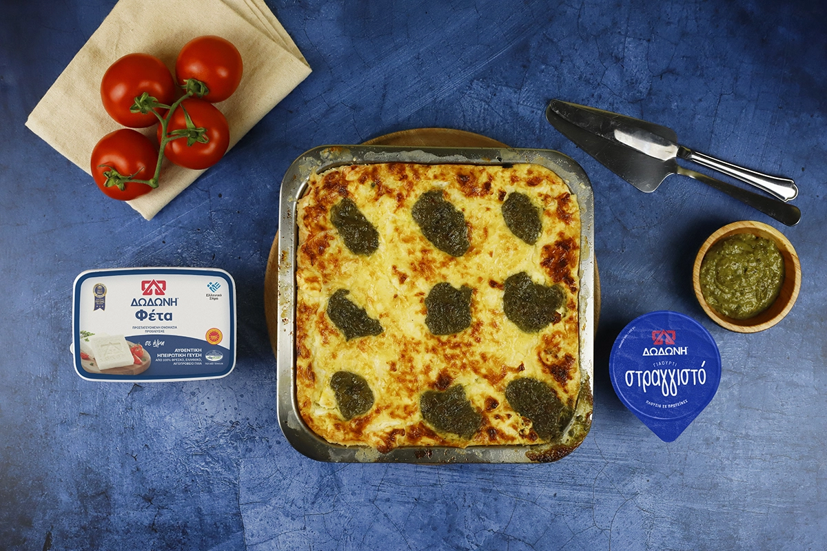 Καλύπτουμε με τη μισή ποσότητα από το μίγμα γιαουρτιού. Έπειτα, προσθέτουμε τη μισή ποσότητα από το πέστο και το απλώνουμε στην επιφάνεια. Επαναλαμβάνουμε την ίδια διαδικασία βάζοντας λαζάνια, φέτες ντομάτας, μίγμα γιαουρτιού και τέλος το πέστο βασιλικού. Ψήνουμε σε καλά προθερμασμένο φούρνο στους 180° για 45 λεπτά.