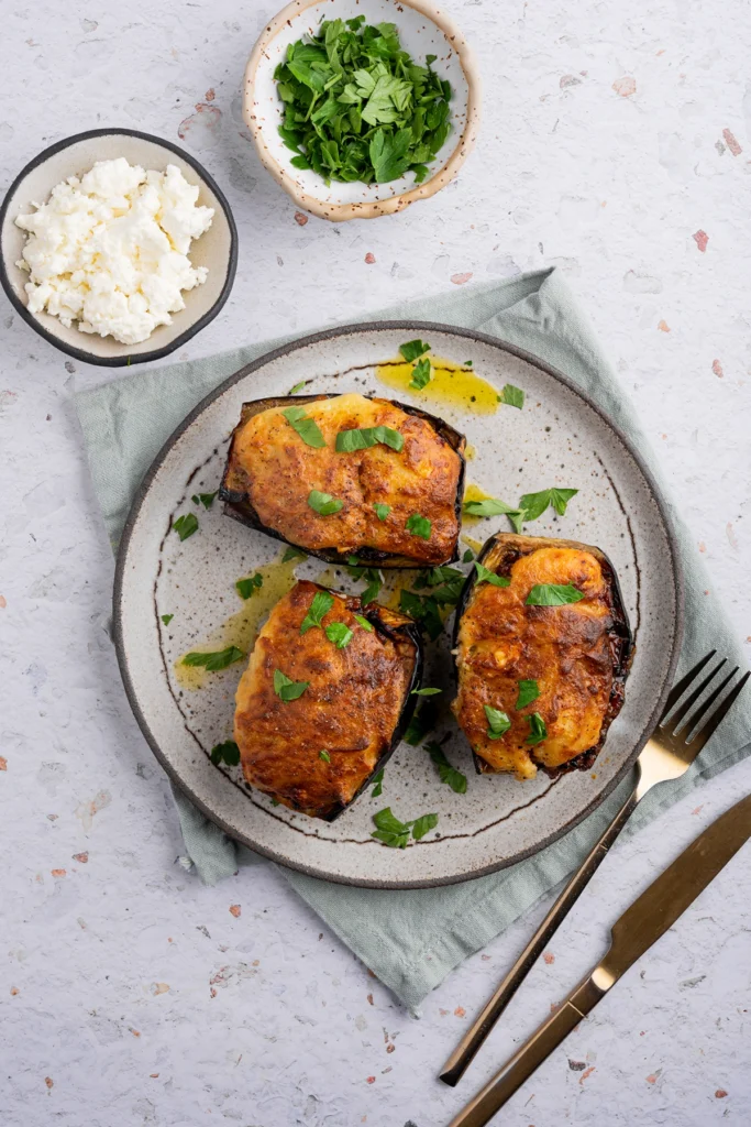 Πλένουμε καλά τις μελιτζάνες. Τις κόβουμε στη μέση και αφαιρούμε την ψίχα αφήνοντας το γύρω τοίχωμα σε πάχος περίπου 2 εκ.