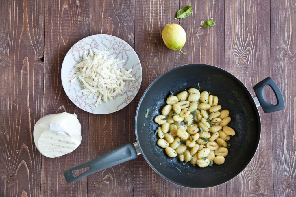 Σε μία κατσαρόλα βράζουμε τα νιόκι για δύο λεπτά. Σουρώνουμε και κρατάμε λίγο νερό από την κατσαρόλα.