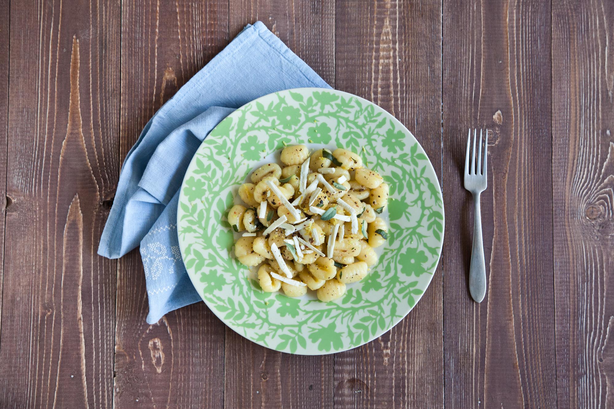 Σε ένα καυτό τηγάνι ρίχνουμε το μισό βούτυρο με το φασκόμηλο. Τσιγαρίζουμε και ρίχνουμε τα νιόκι μέσα στο τηγάνι με το νερό που έχουμε κρατήσει Προσθέτουμε αλάτι, πιπέρι και ξύσμα από ένα λεμόνι. Τέλος ρίχνουμε το υπόλοιπο βούτυρο μέχρι να λιώσει και σερβίρουμε.