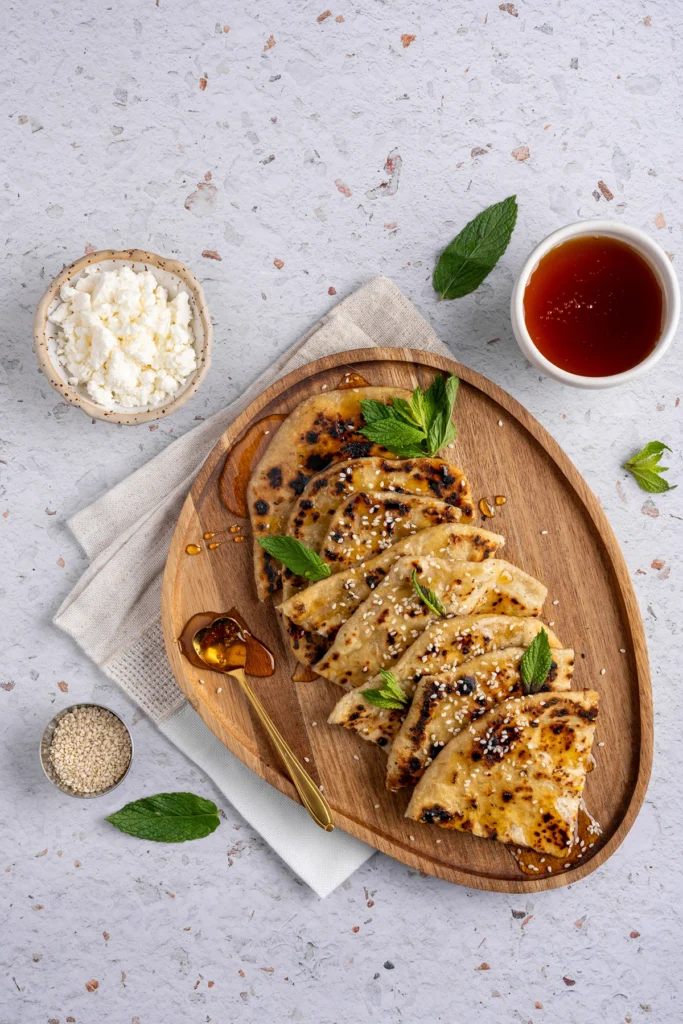 • Περιχύνουμε τις πίτες με μέλι, όσο είναι ακόμη ζεστές. Εάν θέλουμε, τις πασπαλίζουμε με λίγο καβουρδισμένο σουσάμι.
