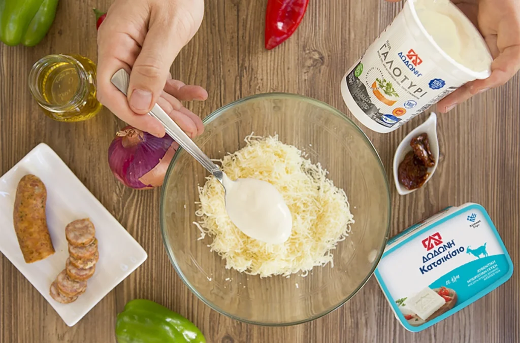 • Βάζουμε το ελαιόλαδο σε ένα αντικολλητικό τηγάνι και μόλις κάψει προσθέτουμε το κρεμμύδι. Σοτάρουμε μέχρι να πάρει ένα ωραίο χρυσό χρώμα. Στη συνέχεια προσθέτουμε τις φέτες λουκάνικο και τις πιπεριές. Σοτάρουμε για λίγο και προσέχουμε να μην μαραθούν αλλά να είναι al dente. Σε ένα μεγάλο μπολ ανακατεύουμε όλα τα τυριά με το γάλα, το βασιλικό και τις λιαστές ντομάτες