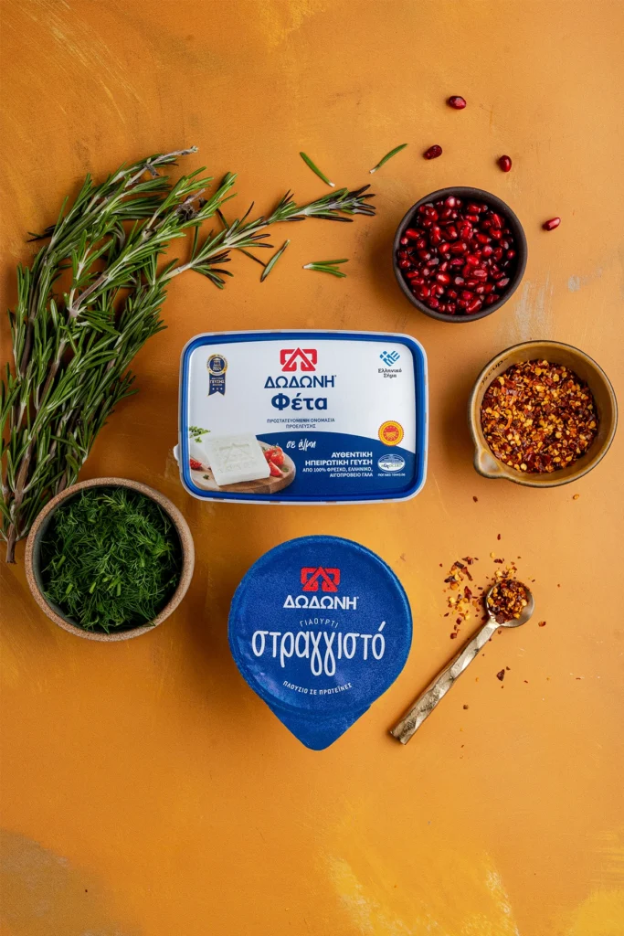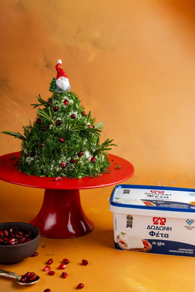 Στη συνέχεια το τοποθετούμε στον δίσκο σερβιρίσματος που θέλουμε, το πασπαλίζουμε με τον άνηθο προσέχοντας να μην αφήνουμε λευκά κενά, προσθέτουμε διάσπαρτα φουντίτσες δεντρολίβανο και στη συνέχεια προσθέτουμε το ρόδι πιέζοντας διάσπαρτα τους σπόρους μέσα στο τυρί.