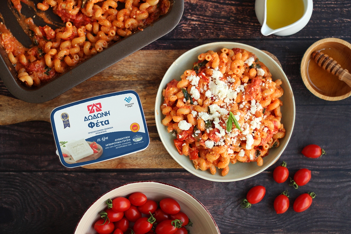 Βράζουμε τα ζυμαρικά σύμφωνα με τις οδηγίες της συσκευασίας. Βγάζουμε το ταψί από το φούρνο, προσθέτουμε τα ζυμαρικά και τα ψιλοκομμένα μυρωδικά. Ανακατεύουμε καλά. Σερβίρουμε και προαιρετικά τρίβουμε έξτρα φέτα από πάνω.