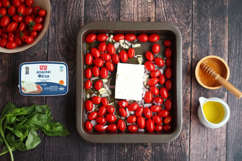Προθερμαίνουμε το φούρνο μας στους 200°C. Σε ένα ταψάκι βάζουμε το ελαιόλαδο, το κρεμμύδι, το σκόρδο, τα ντοματίνια, αλάτι, πιπέρι και τη φέτα. Προαιρετικά βάζουμε και ένα κουταλάκι του γλυκού μέλι. Ψήνουμε στους 200°C για 30-40 λεπτά.